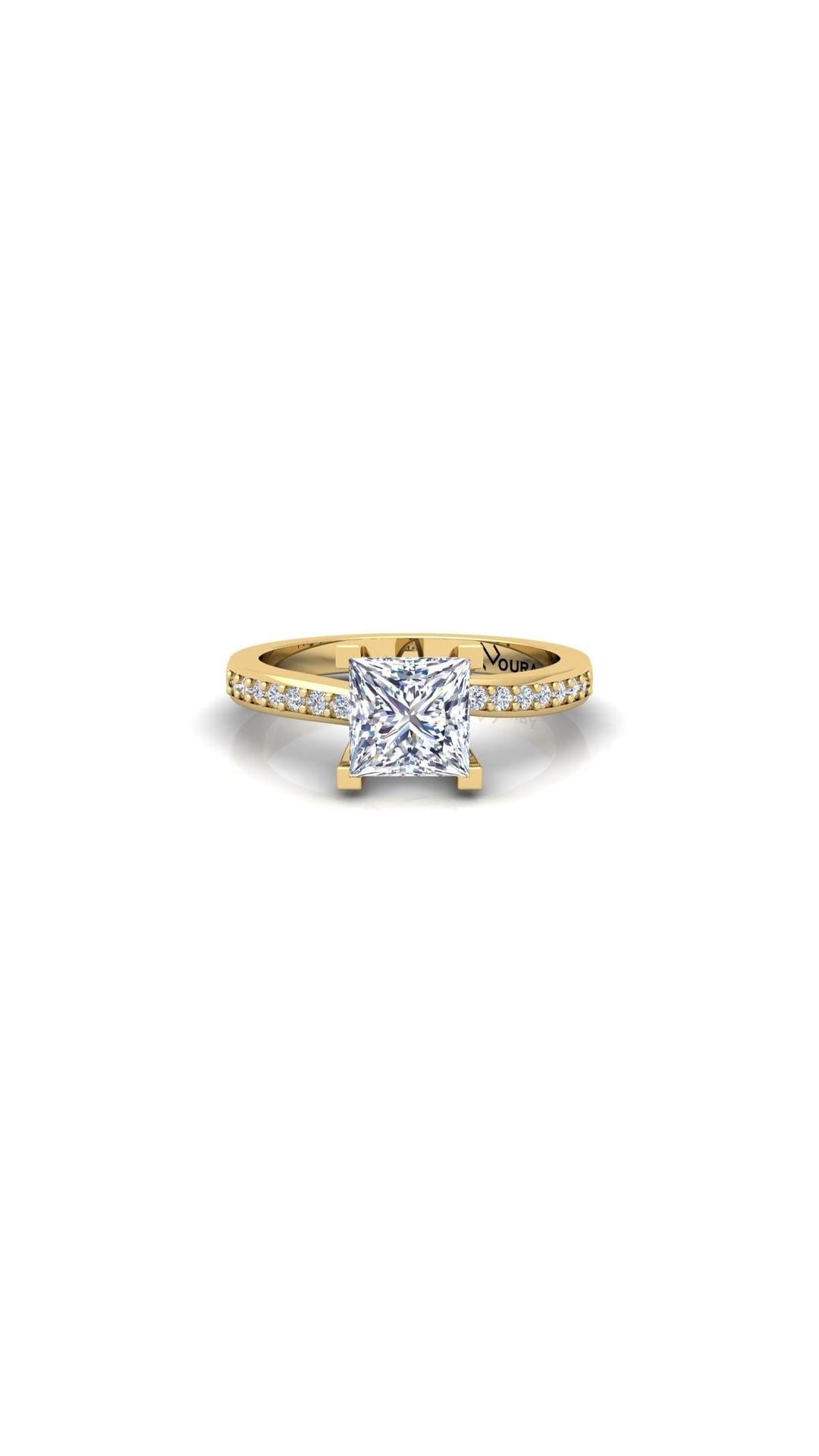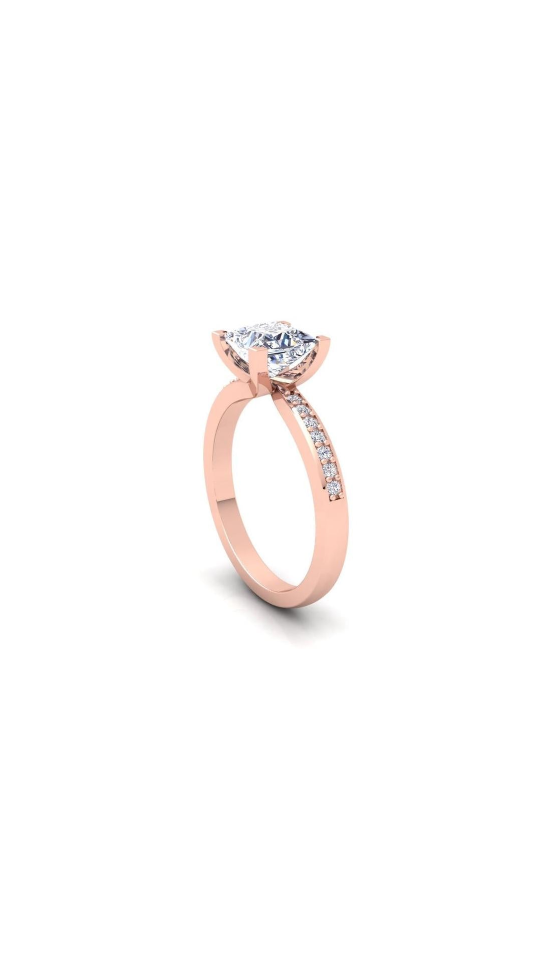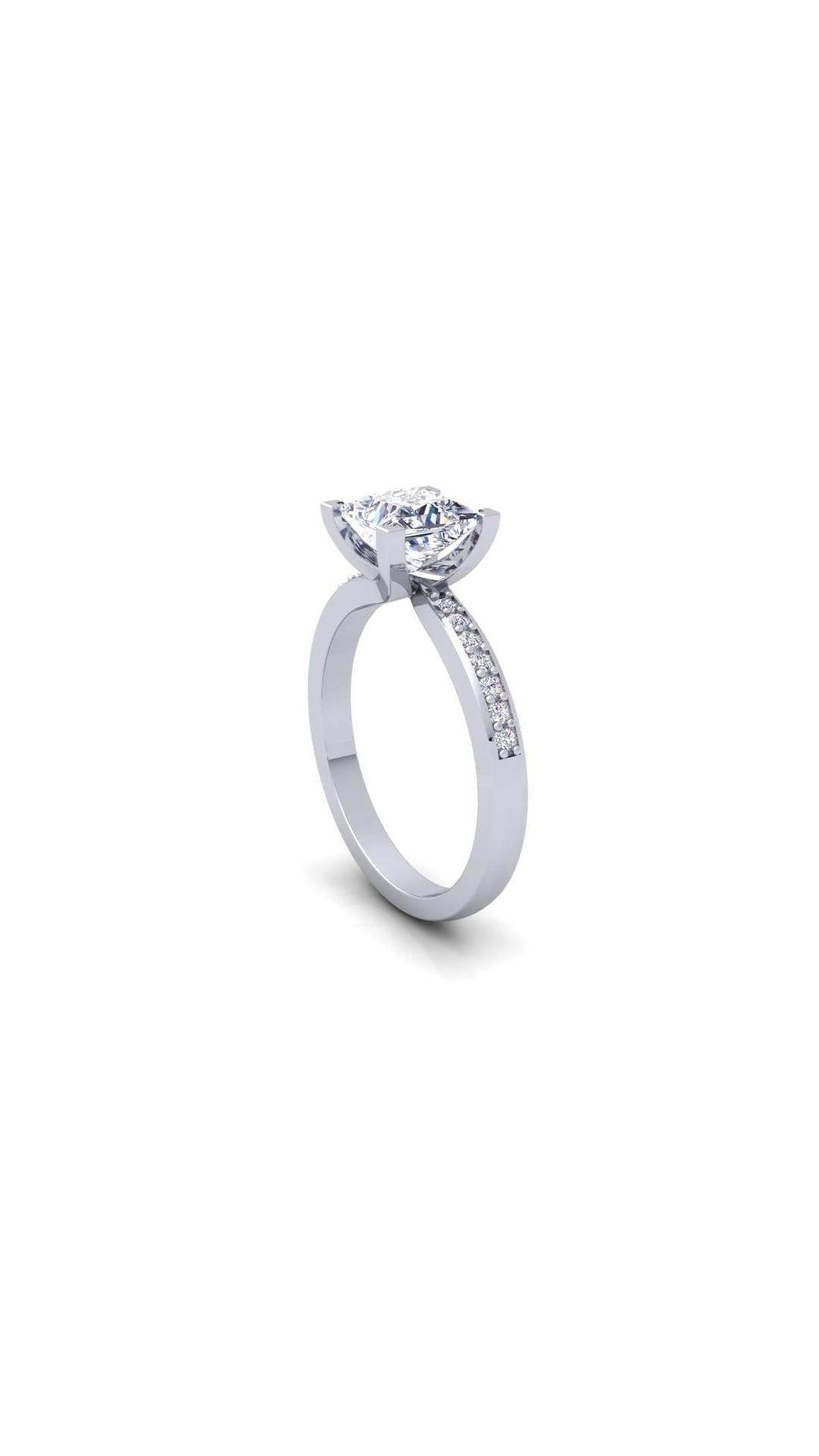 This ring's design lends itself to its large center princess cut diamond. With the center diamond set up in a pave setting, this ring gives a modern twist to a classic design with a gentle offset in the band. Being both timeless and unique, this ring is sure to impress.