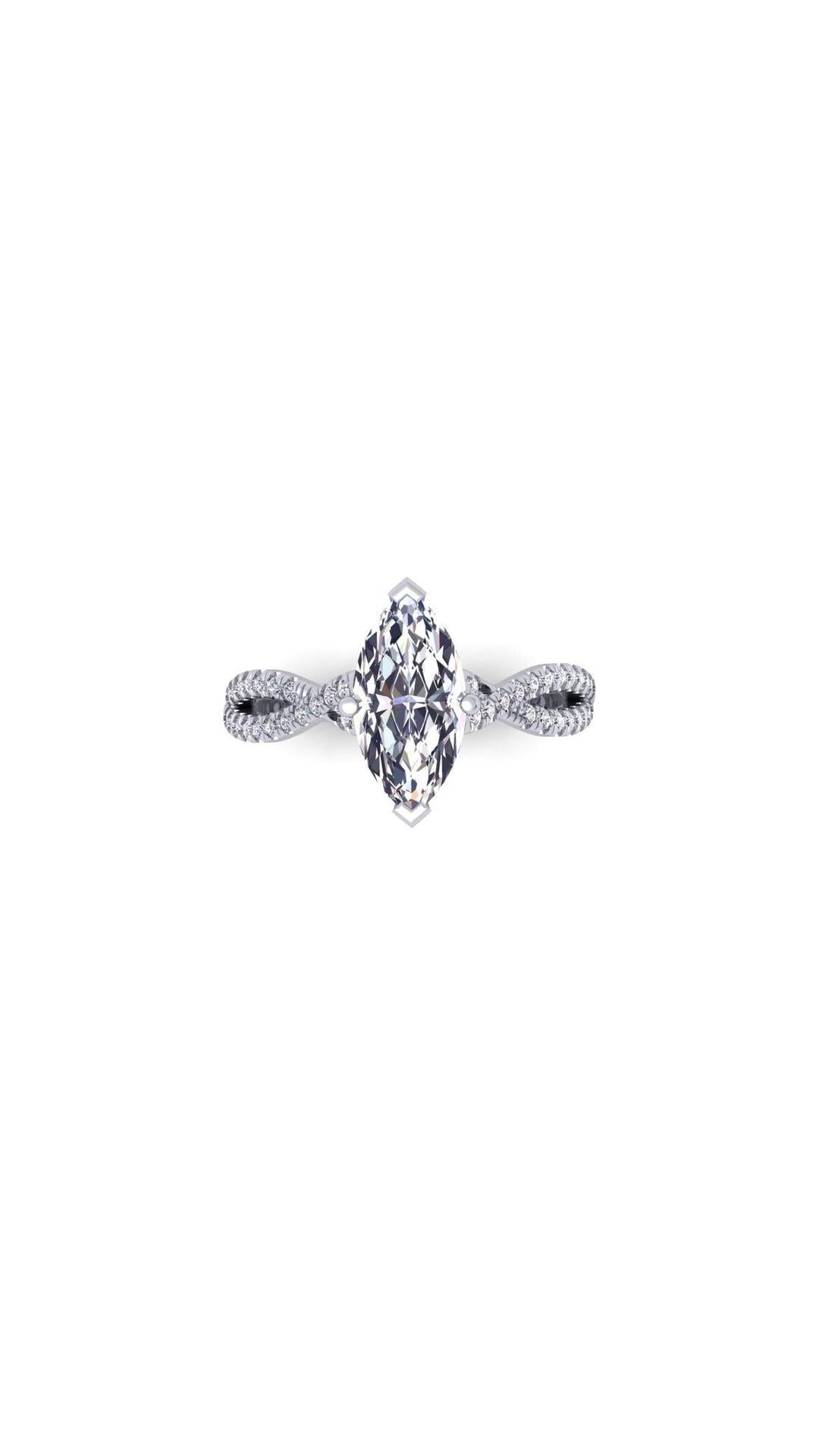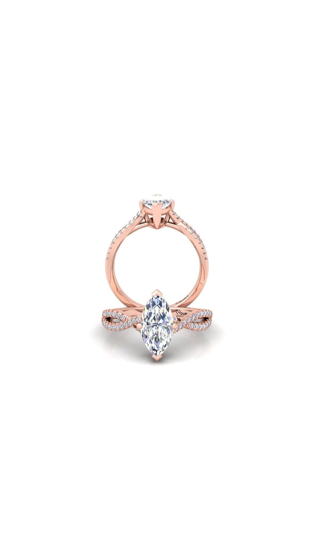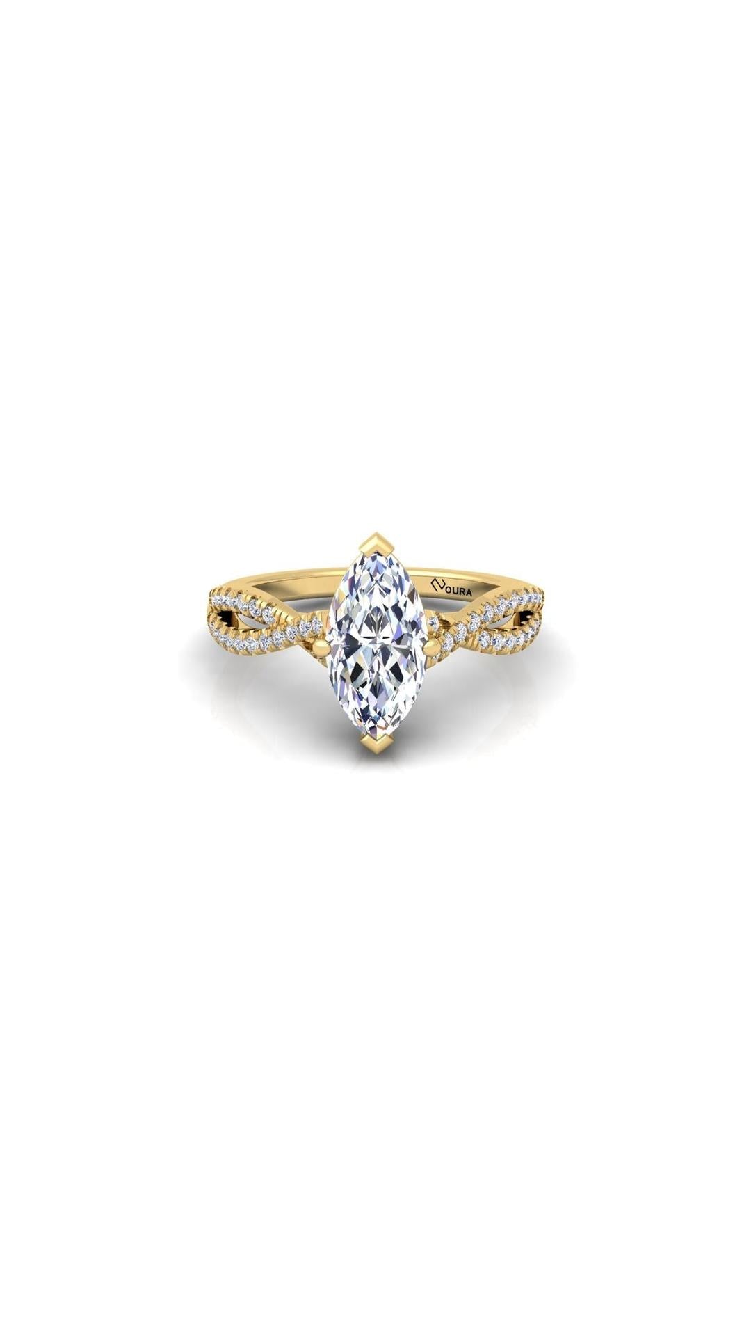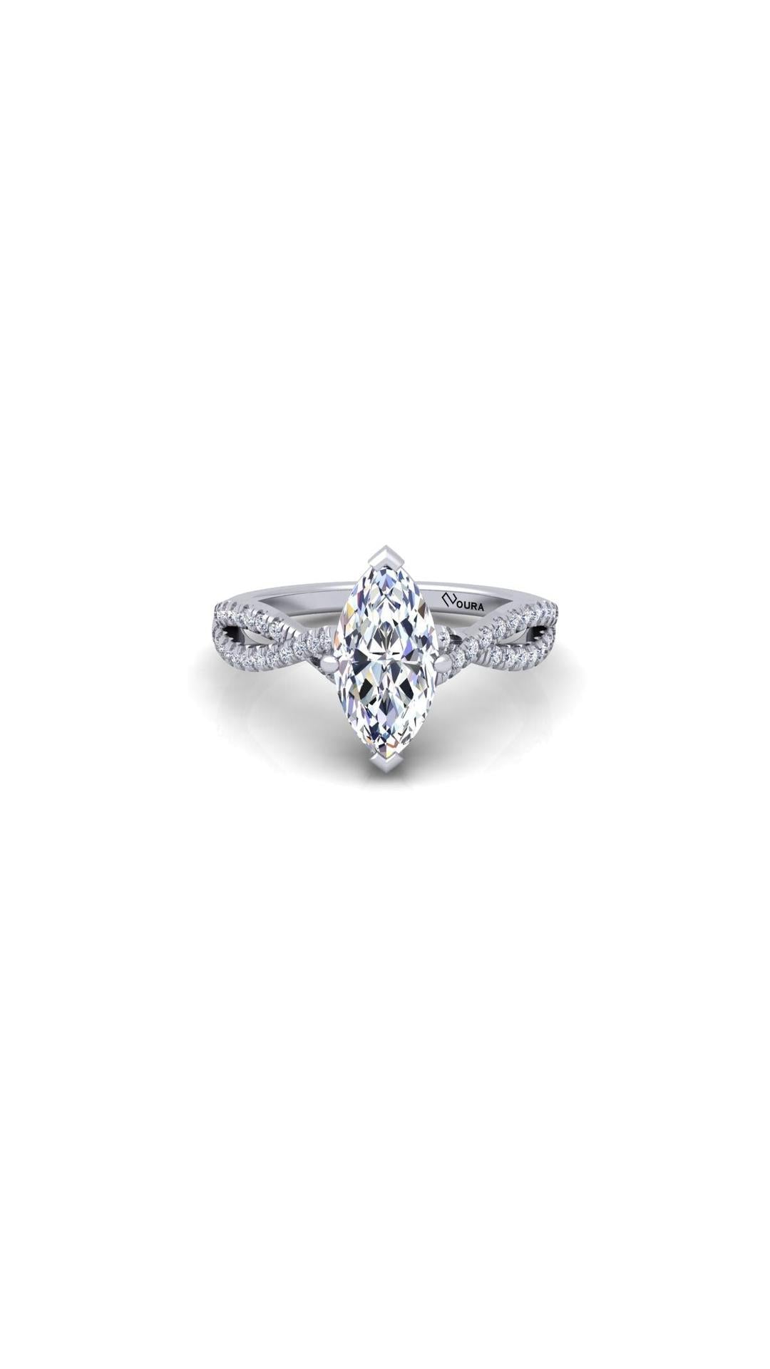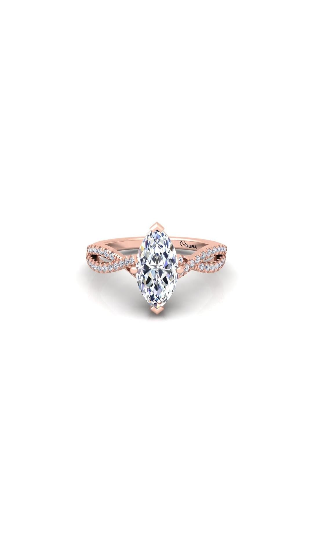 The Soul engagement ring features a stunning 1 ct Marquise central diamond as its center piece. The central stone is seated upon a criss cross styled shank that's beaded with smaller diamonds. These features combined together creates a beautifully crafted ring who's creation was inspired by the inexplicable beauty of a joyful soul.