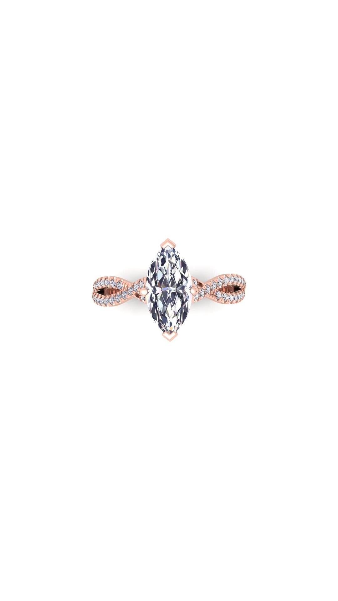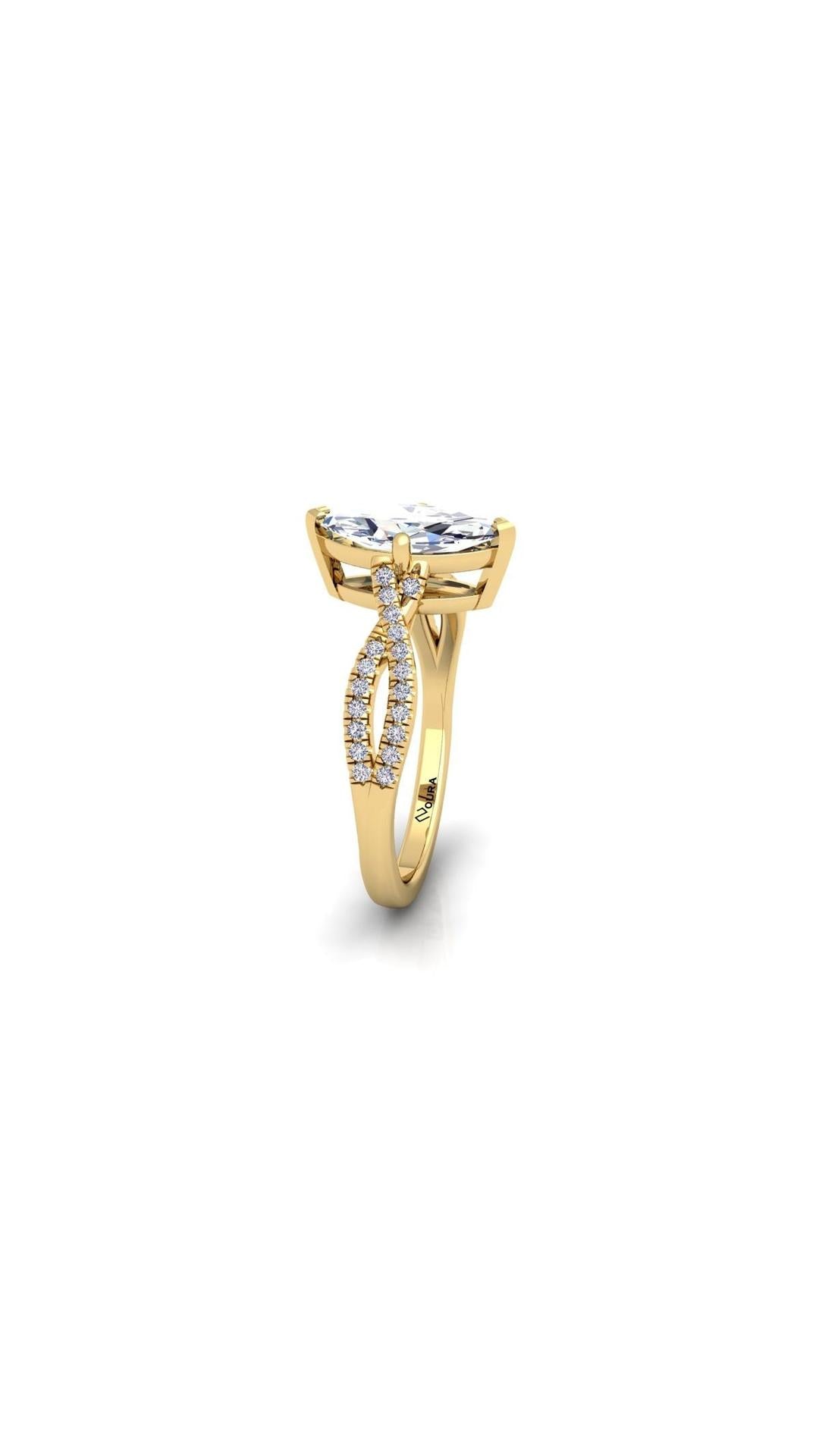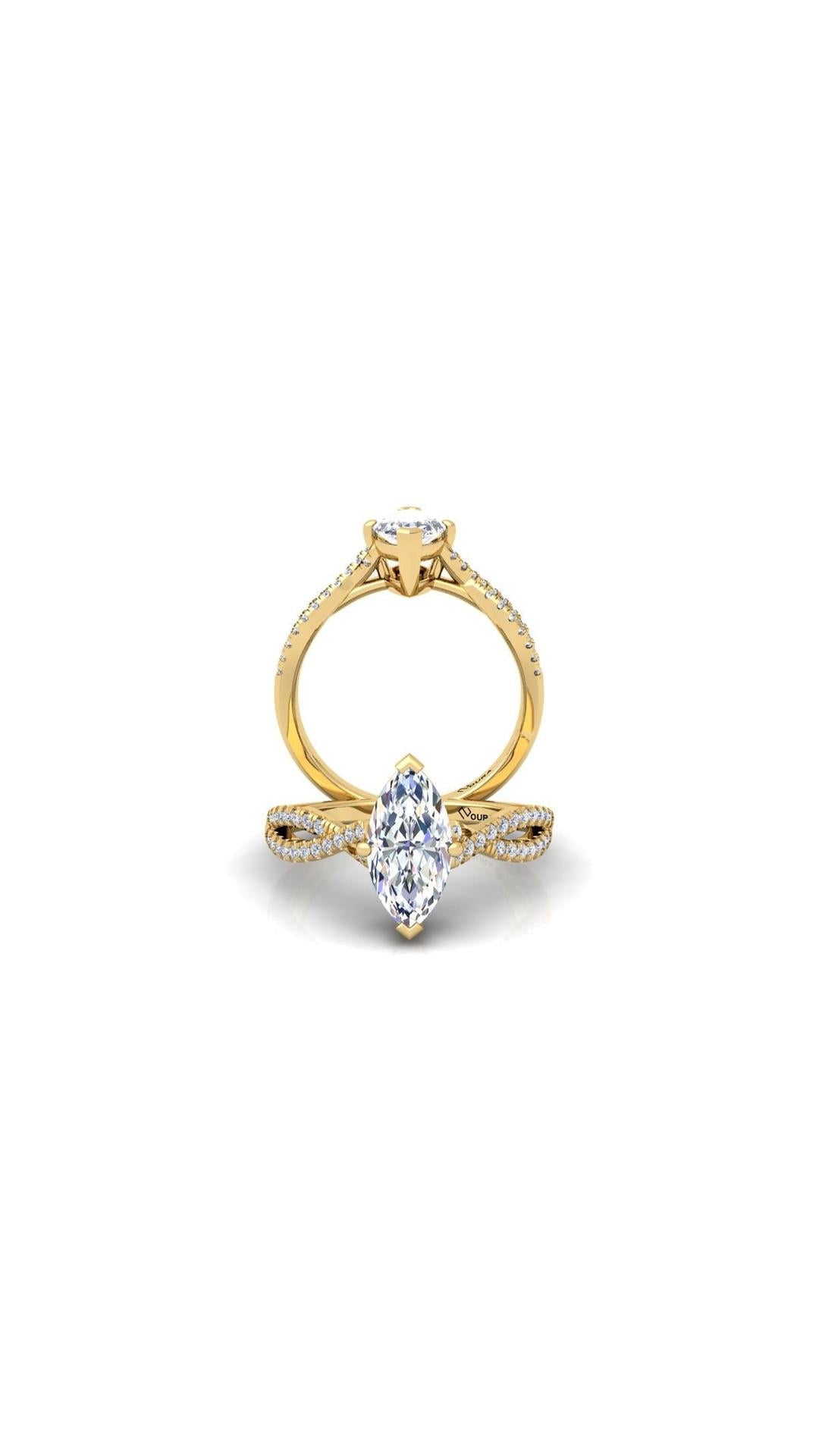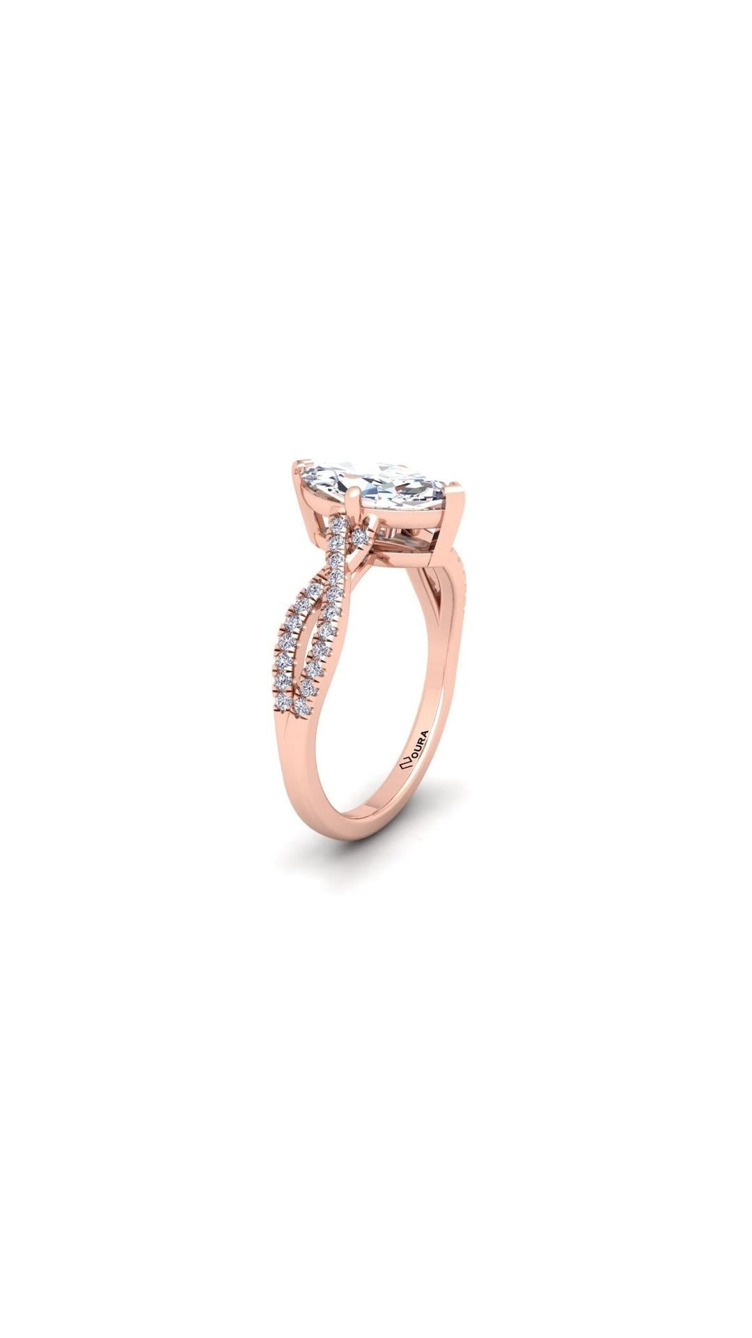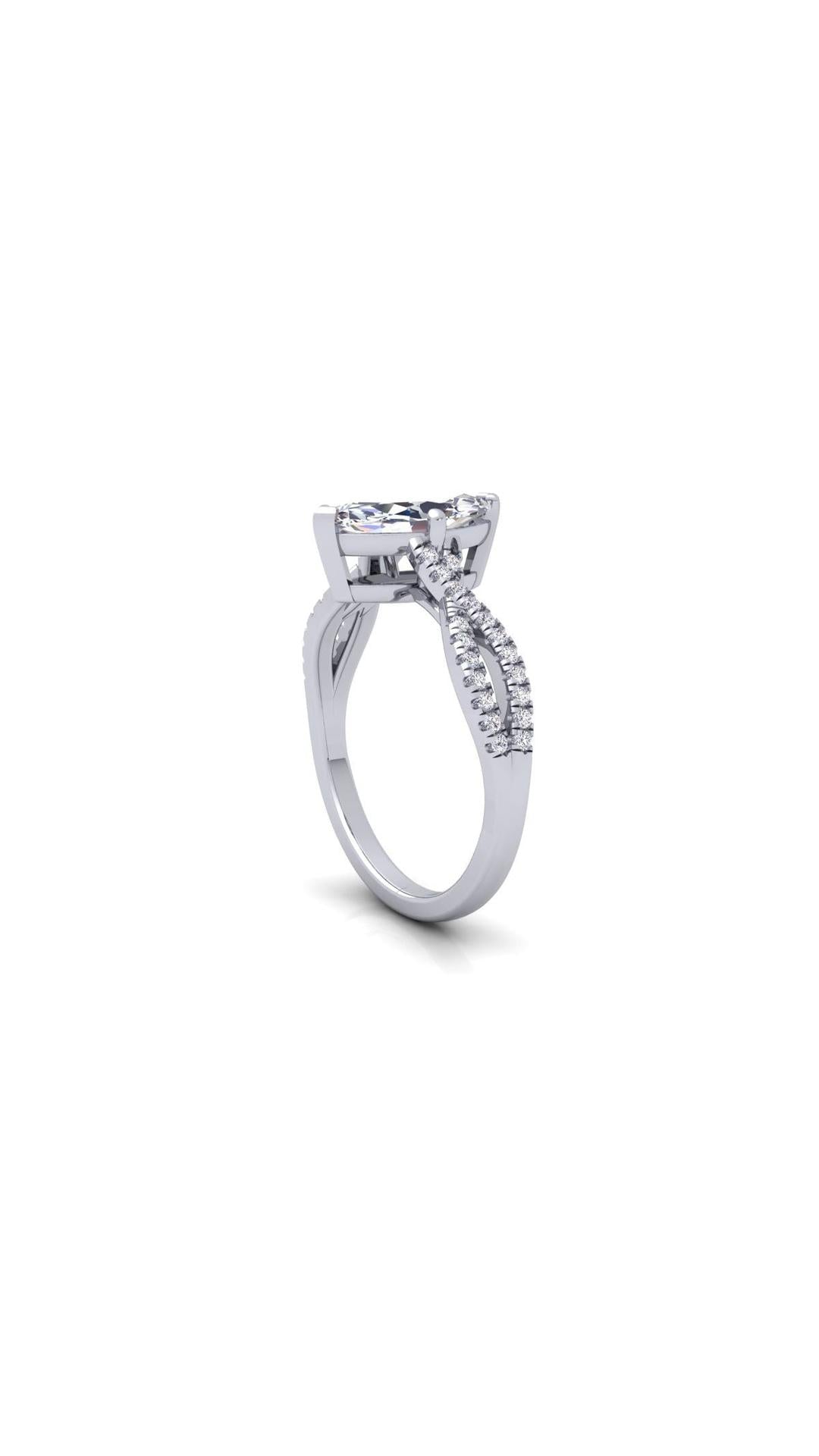 The Soul engagement ring features a stunning 1 ct Marquise central diamond as its center piece. The central stone is seated upon a criss cross styled shank that's beaded with smaller diamonds. These features combined together creates a beautifully crafted ring who's creation was inspired by the inexplicable beauty of a joyful soul.